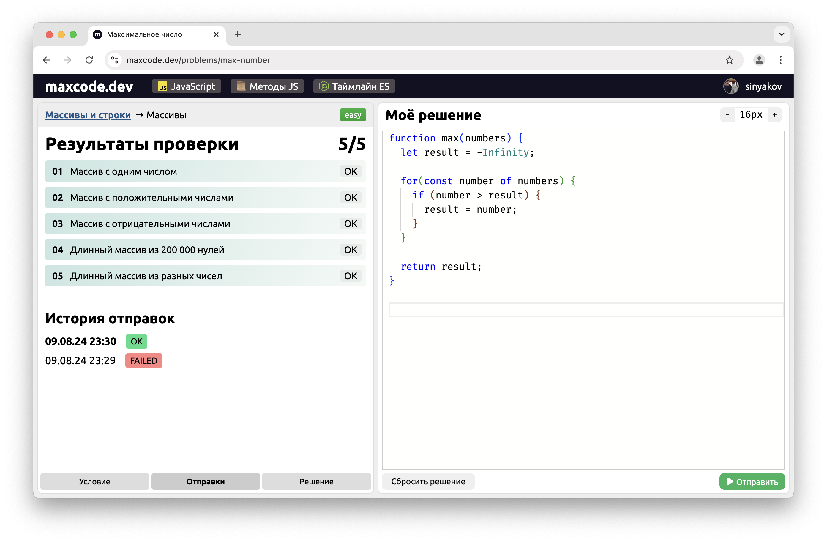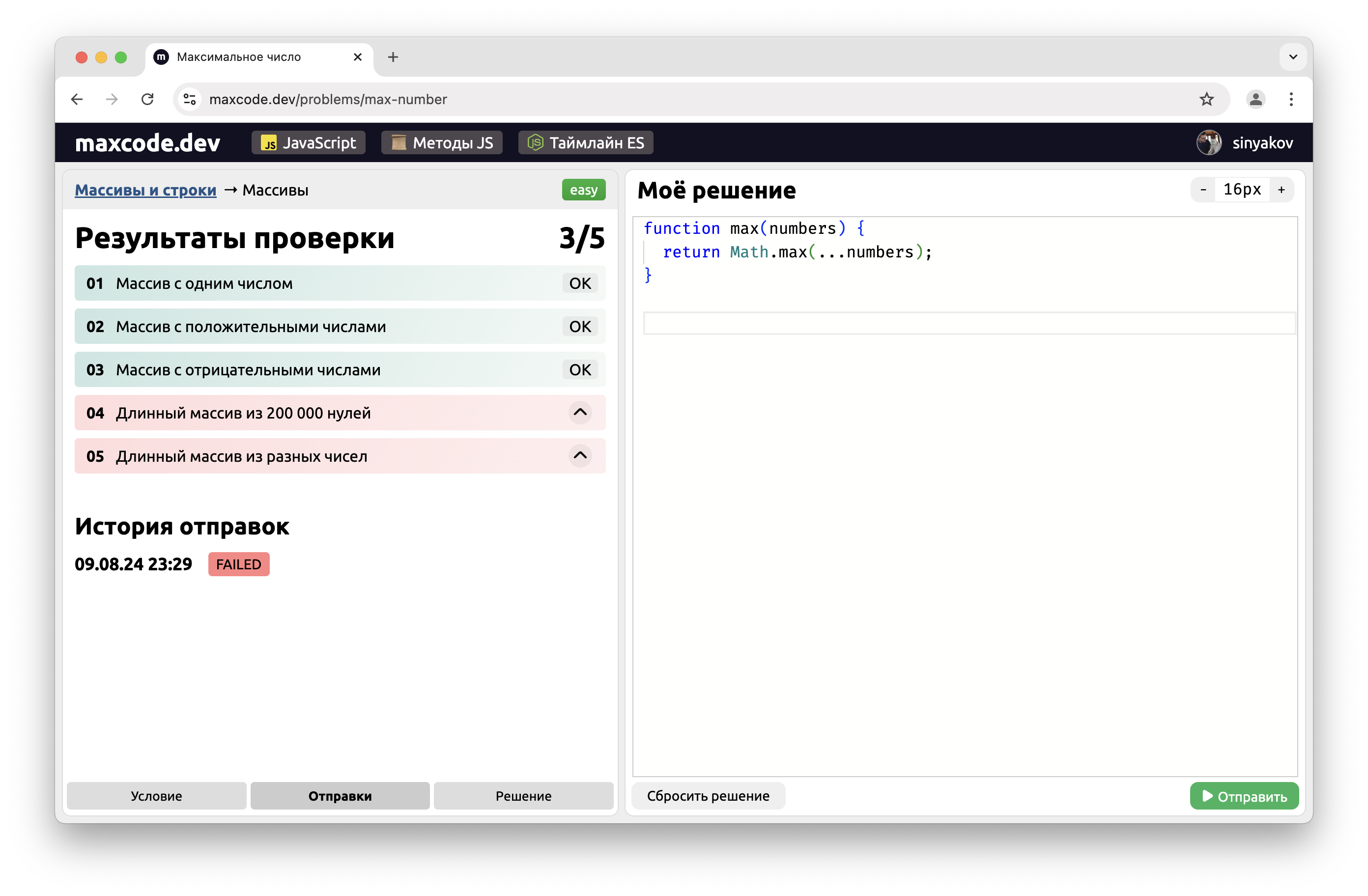После нажатия на кнопку «Отправить» решение уходит на проверку. Через несколько секунд приходят результаты тестов.