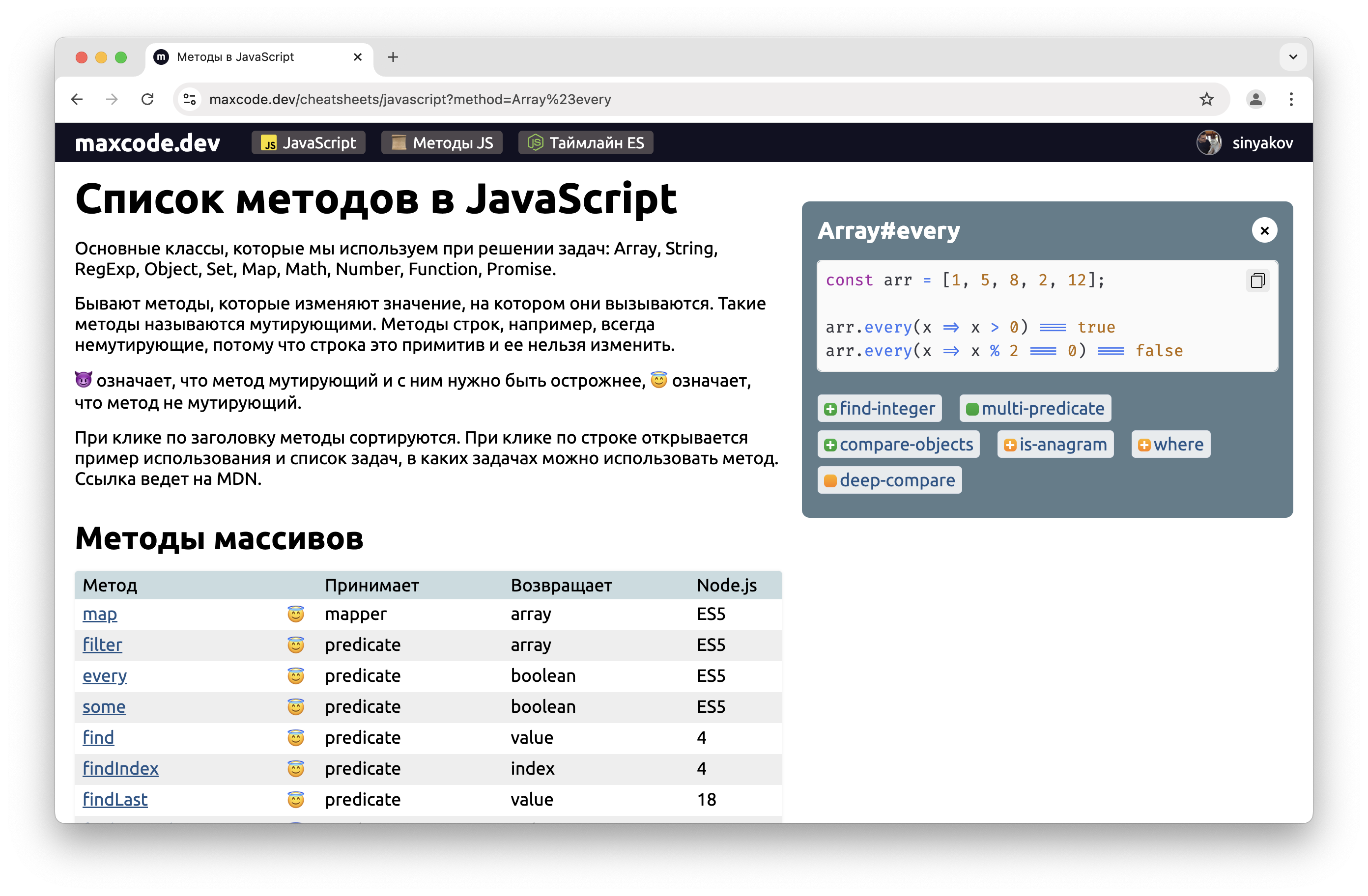В разделе Список методов в JavaScript, можно посмотреть, что принимает и возвращает каждый метод. По клику на строчку открывается пример использования и список задач, в которых можно потренироваться использовать метод.